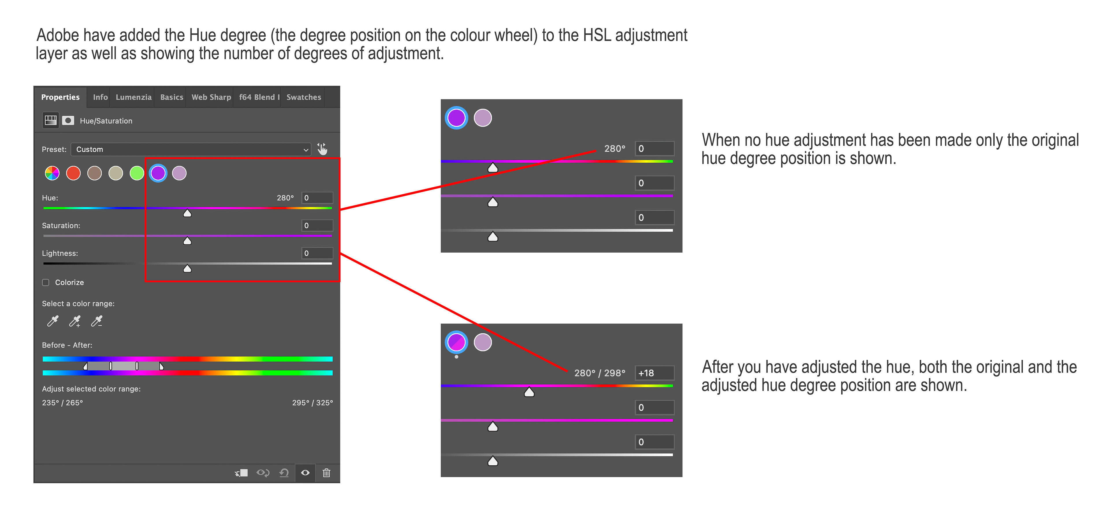 Another improvement is that the degree position on the Hue wheel of the selected and the adjusted colour has been added to the Properties Panel of the Hue Saturation adjustment layer (see Figure 4).