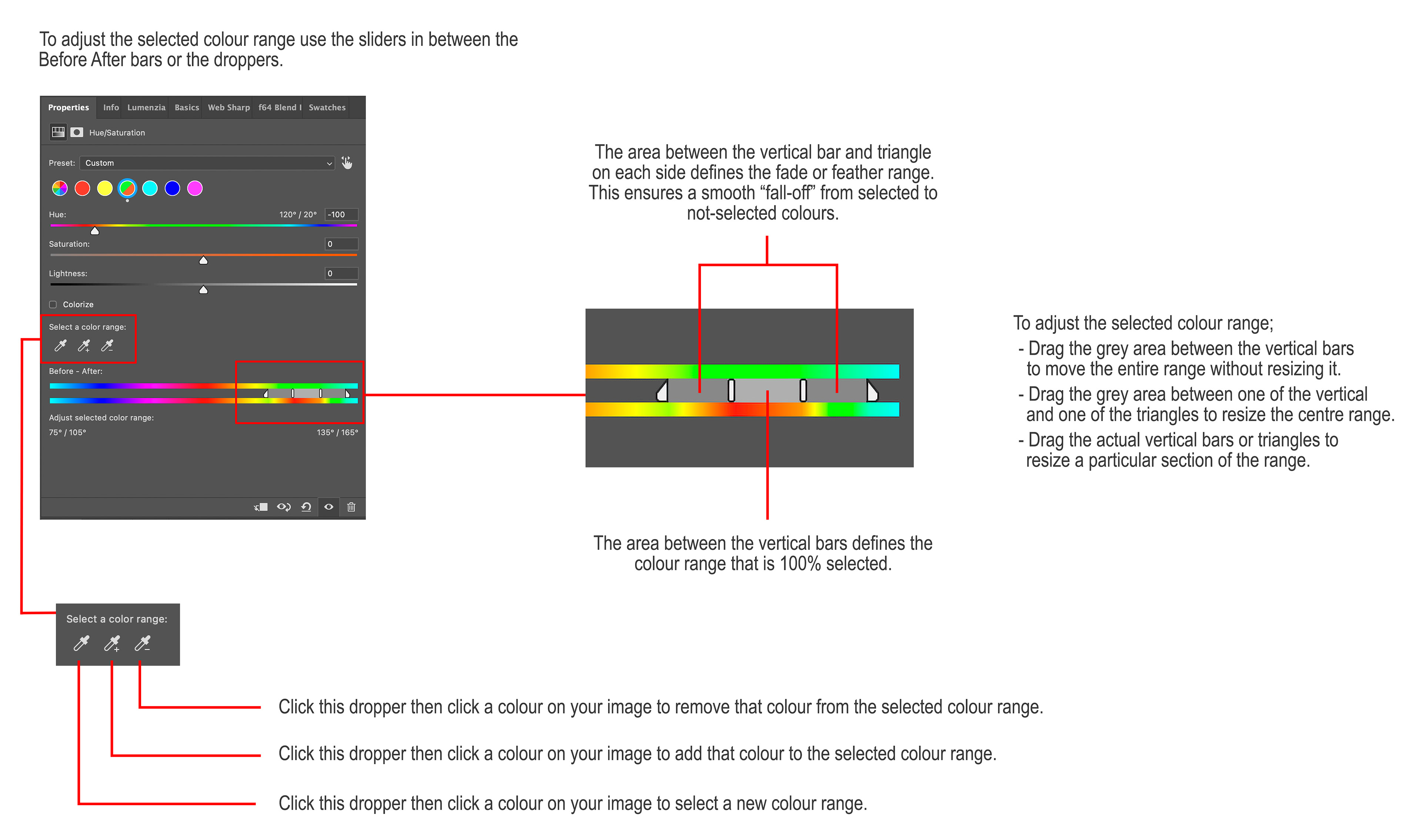Once a colour has been selected you will see a grey area between the Before / After colour bars. The lighter grey area between the vertical bars shows the colour spectrum that is 100% selected, the darker grey area on either side of this, between the triangle and vertical bar shows the colour spectrum that fades off or is feathered to ensure a smooth transition from selected to not-selected colours.