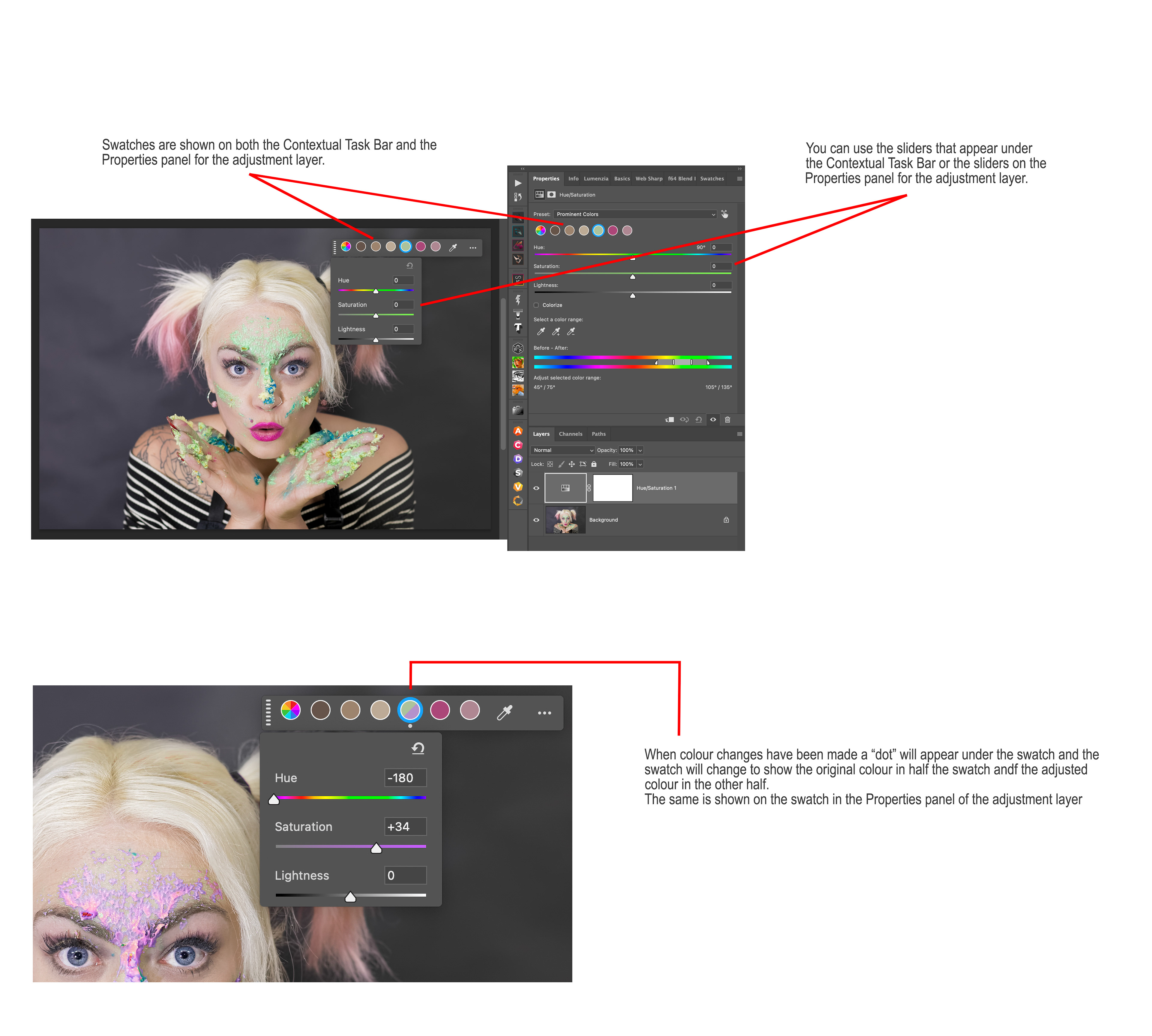 When you have adjusted colours using the sliders, the relevant colour swatch (in both the Contextual Task Bar and the Properties Panel) will show a white dot underneath the swatch, and the lower half of the swatch will change to show the adjusted colour (see Figure 2).